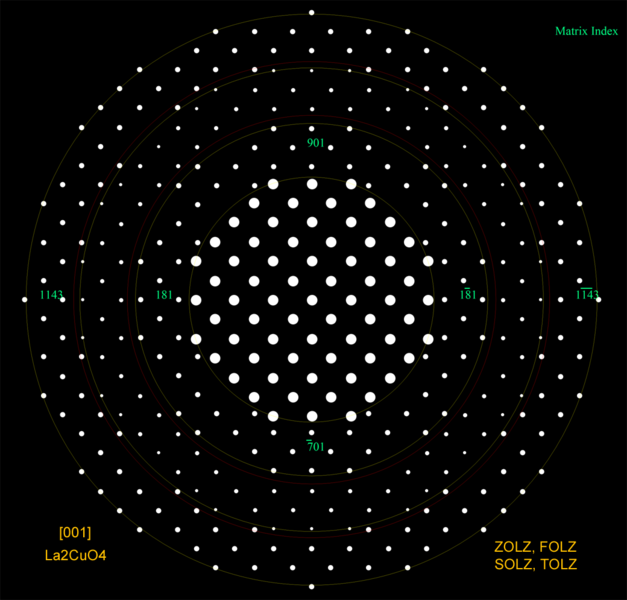 Movable inner and outer circles for HOLZs for the zone axis electron diffraction pattern view.HOLZ Pattern of La2CuO4