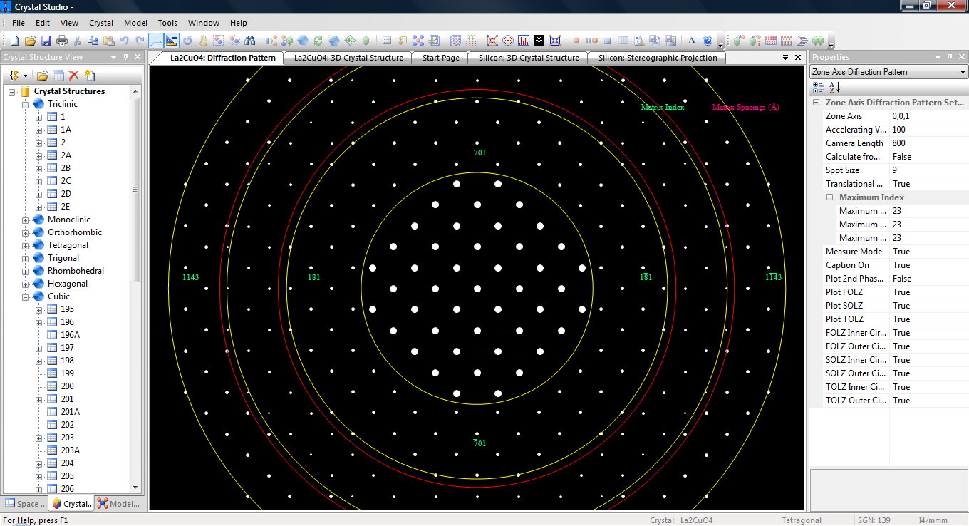 The Zone Axis Diffraction Pattern View with the "Crystal Structure View" tree view on the left and the "Property Window" on the right.