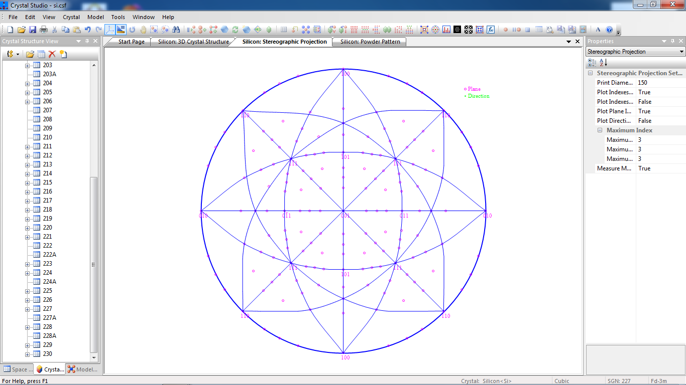 The Stereographic Projection View with the "Crystal Structure View" tree view on the left and the "Property Window" on the right.