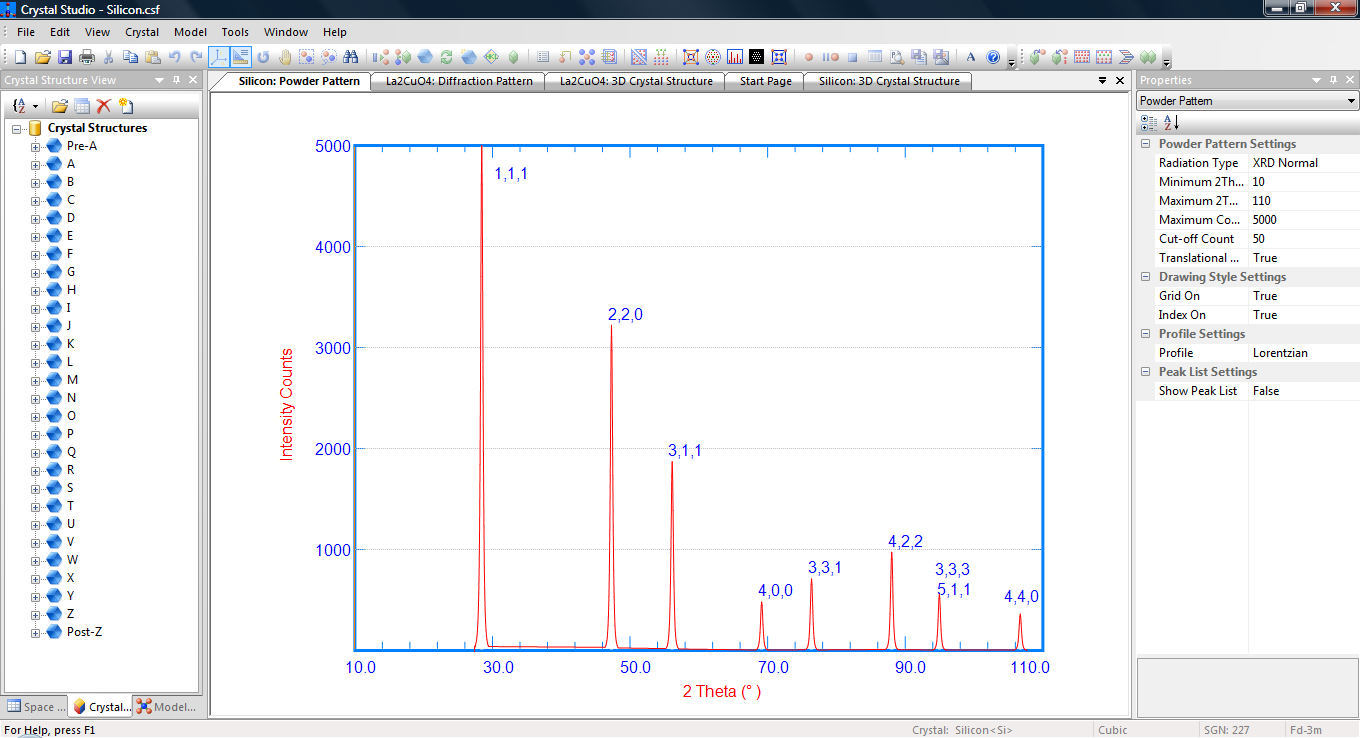 The Powder Pattern View with the "Crystal Structure View" tree view on the left and the "Property Window" on the right.